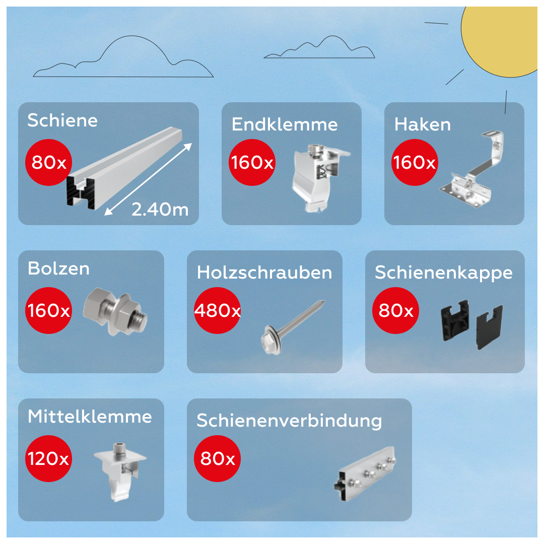 Das Montageset besteht aus Aluminium und Edelstahl, was nicht nur für eine robuste Struktur sorgt, sondern auch eine lange Lebensdauer gewährleistet. Die Verwendung von hochwertigem Material garantiert nicht nur Stabilität, sondern auch eine optimale Widerstandsfähigkeit gegenüber den wechselnden Wetterbedingungen. Dies ist besonders wichtig, um sicherzustellen, dass die Photovoltaikanlage über viele Jahre hinweg zuverlässig funktioniert.